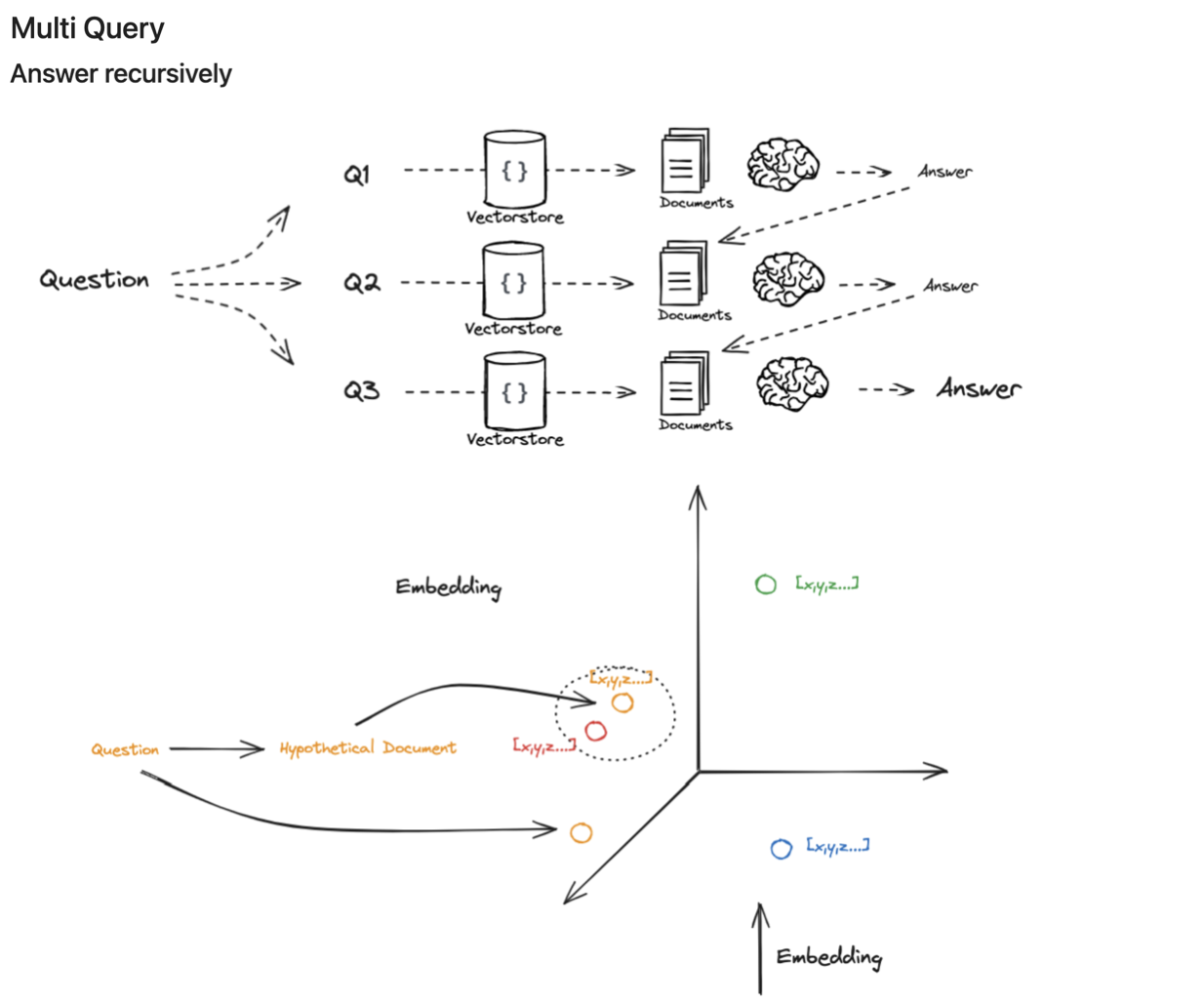 - RAG의 chain에서는 질문-문서의 임베딩, 수치화를 통해 둘 간의 유사성을 찾는다. 하지만 문서는 매우 큰 덩어리이며 질문은 짧고 모호하게 작성되는 경우가 많아 한번에 효율적으로 매칭되기 어렵다.