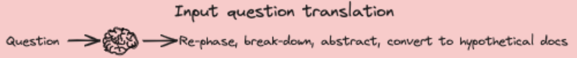 - HyDE(Hypothetical Document Embeddings)는 이러한 쿼리 번역 기술의 하나로, 초기 질문을 더욱 구체적이며 외부 문서와 근접한 가상의 문서로 변환하여 RAG의 인덱싱-검색 단계에서 유효한 연관 문서와 더 가까이 배치시킨다.
