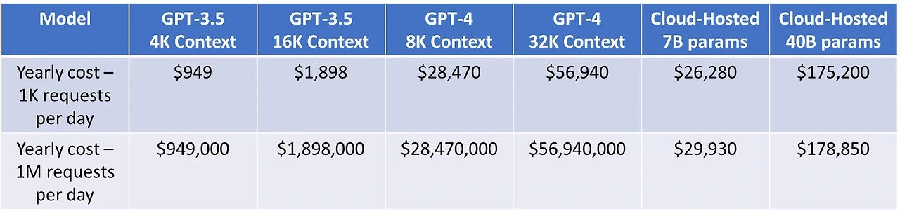 - 연간 서비스에 있어 비교적 적은 토큰을 이용한다면 GPT가 경제적일 수 있지만 비즈니스에서 대량의 토큰을 이용한다면 오픈소스 언어 모델들이 더 저렴할 수 있다.
